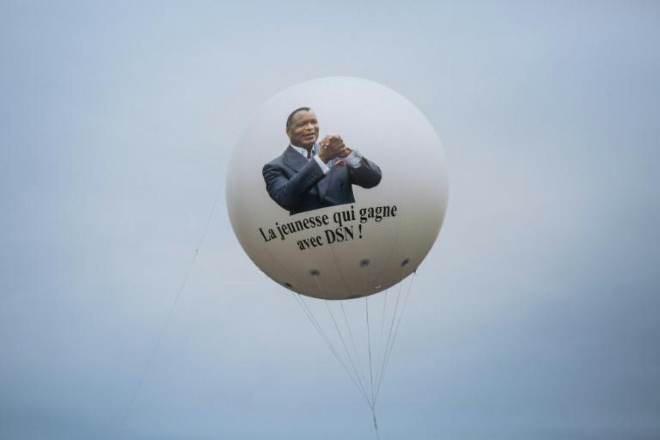 Un ballon portant la photo du président sortant et candidat à sa réélection Denis Sassou-Nguesso à Brazzaville le 19 mars 2021.